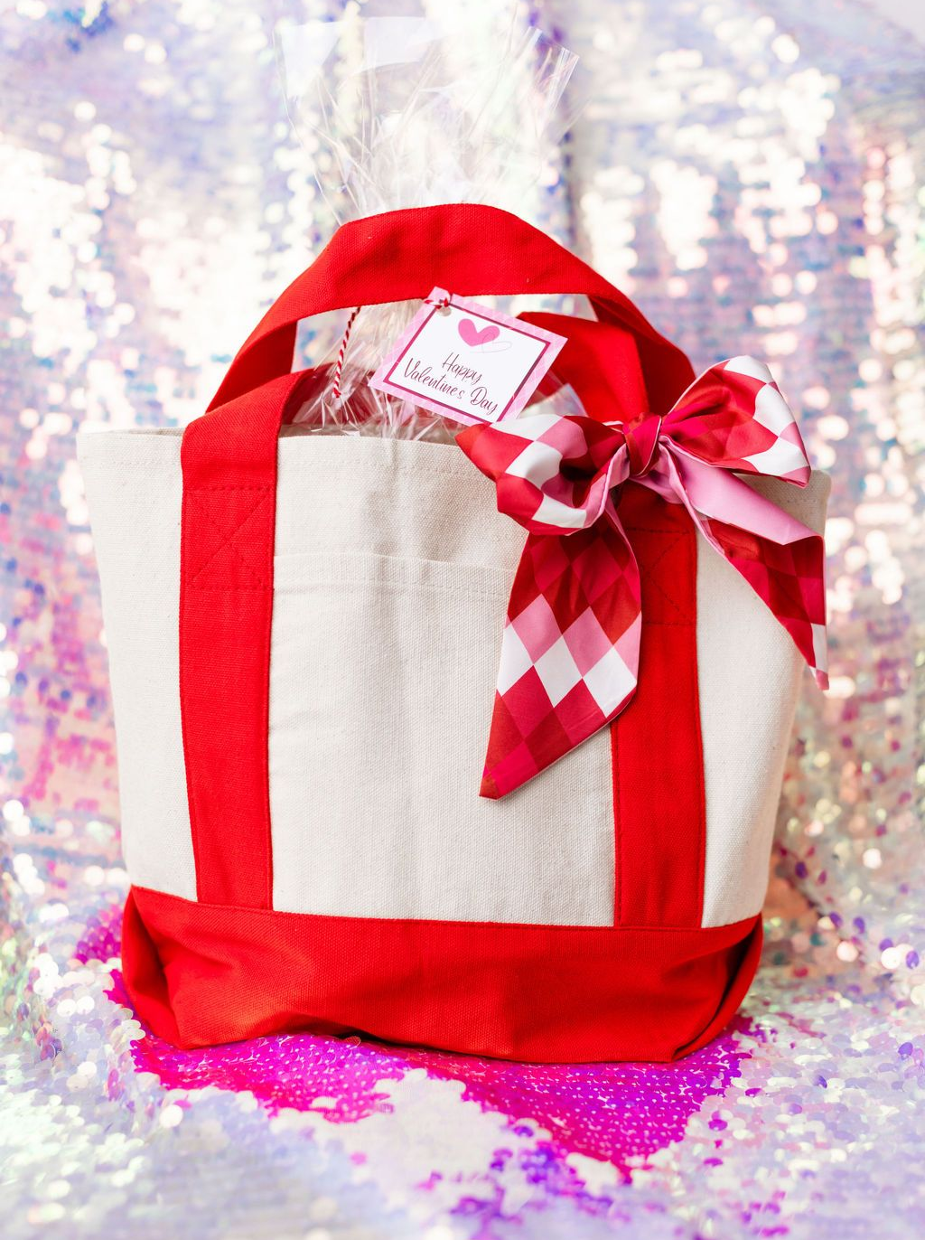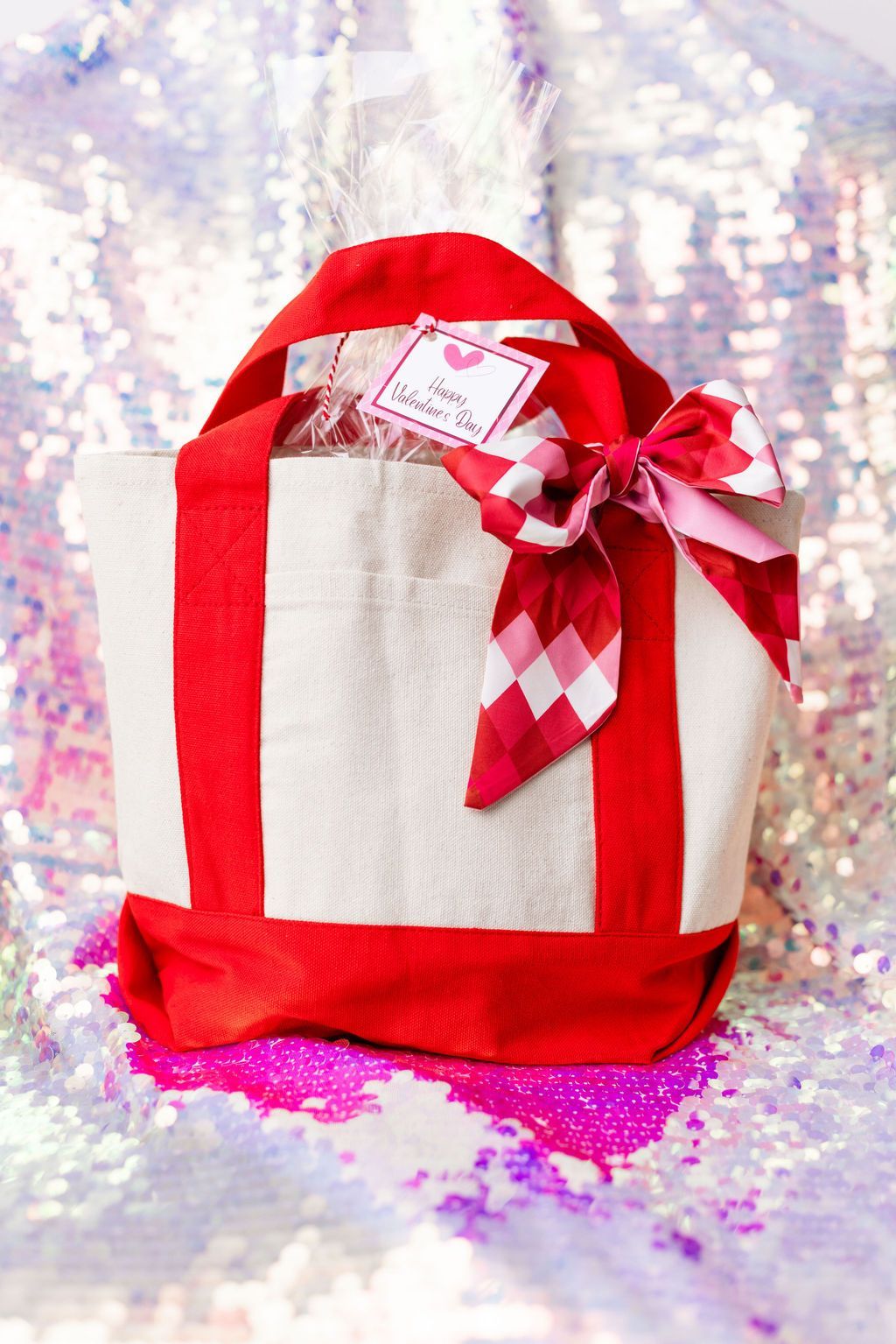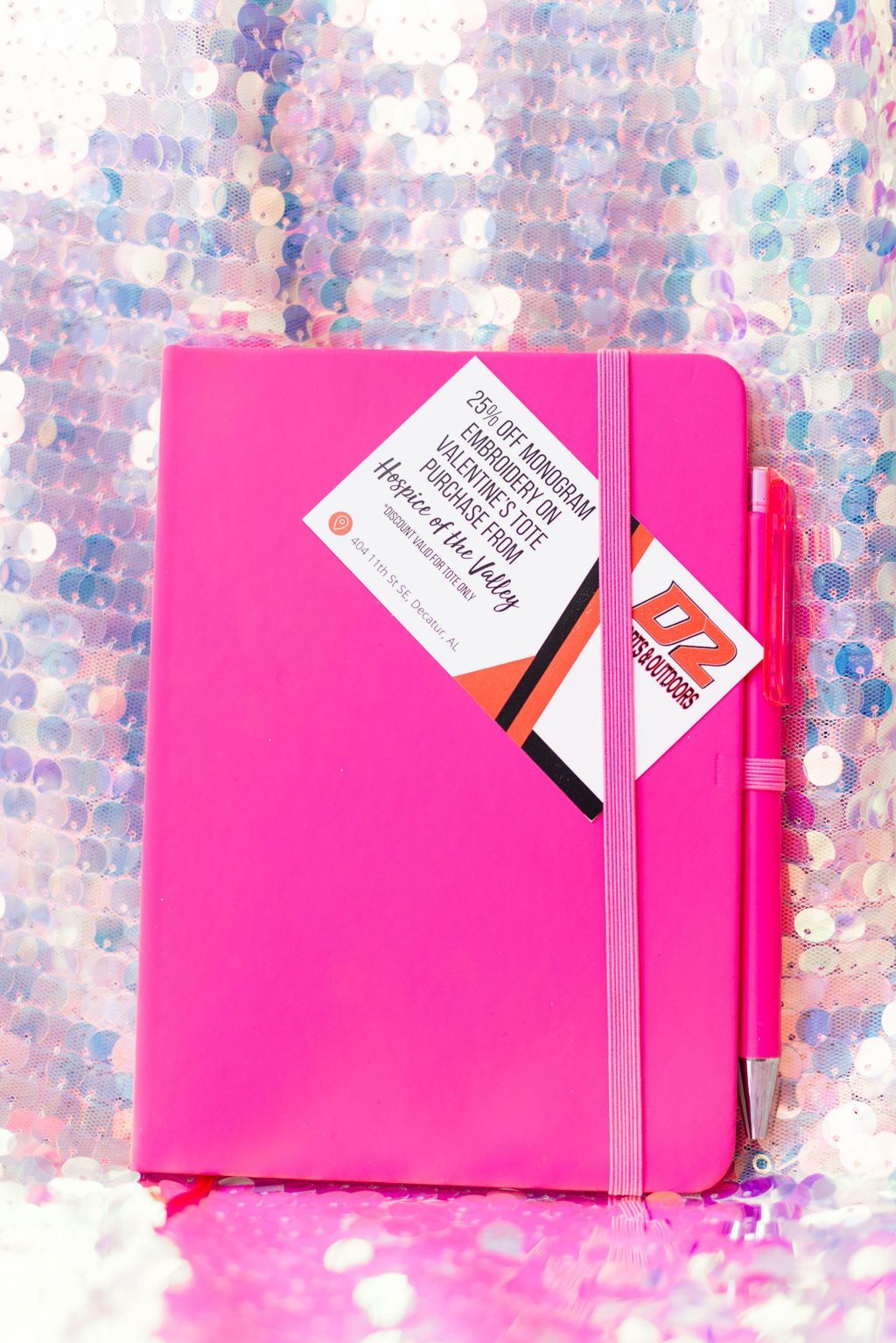 A pink journal/notebook and pen set is perfect for all your love notes, and a versatile satin scarf completes the gift, ready to style the tote, a ponytail, or wear as a chic accessory. A discount coupon from Decatur's own D2 Sports allows your Valentine to take their tote for a custom monogram embroidery.